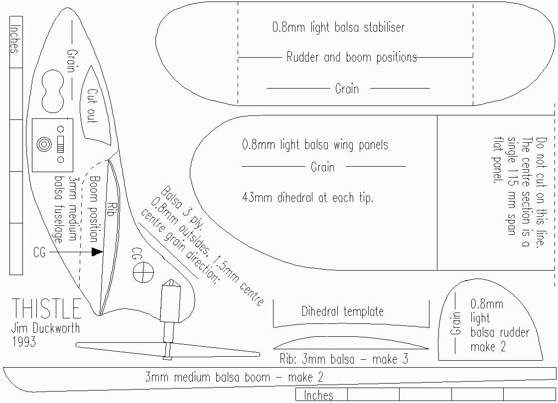 Mine flew in a 30-40 foot right-hand circle without any adjustment though the turn opened right out when the power ran down. I didn't like the straight glide so I bent a little right rudder into the left-hand fin. This tightened the power turn very slightly but the glide was now a definite turn though still more open than the climb. A 15 second charge from three alkaline D cells gave a 20 second motor run; this was enough to climb to 30 feet or so with flights of 30-40 seconds at dusk. However, there was a tendency to mush along nose high as the initial power burst died down. The KP00 is supplied with an adjustable pitch propeller which I guessed I might have set to too fine a pitch. This could result in too low a climb speed, which would explain the mushing and slow climb, so I increased the propeller pitch to about 30 degrees, giving 4,600 - 4,700 rpm on a 45 second charge. This increased the climb speed and altitude as well as curing the mushing tendency. My Thistle now flies consistently for 90 seconds off a 45 second charge in liftless late evening conditions. Jim's warning about thermals seems justified even though the glide is relatively steep. This is due to drag from the windmilling prop, which continues to spin until the model lands.