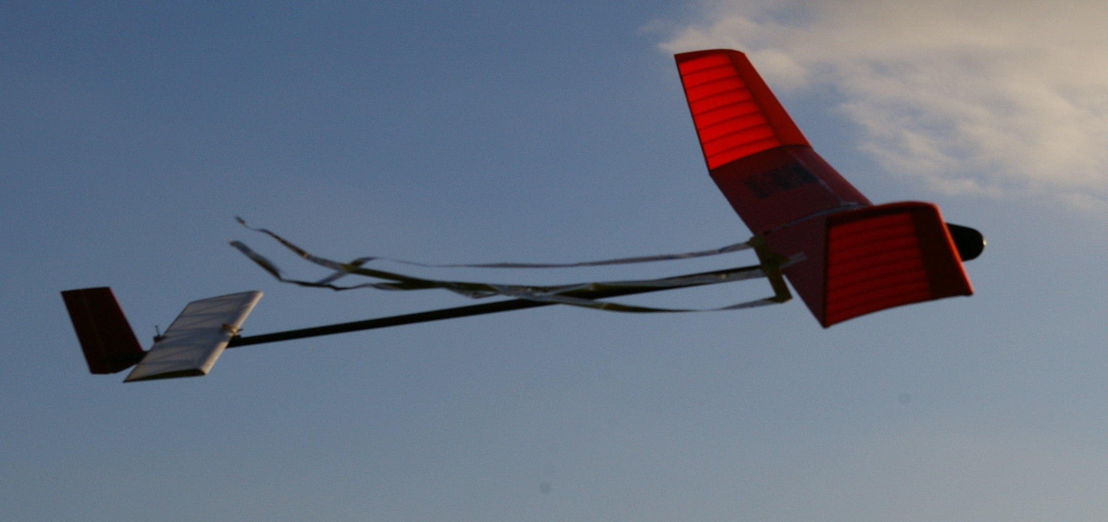 Back in 2009 I had a play with a wing wake visualiser - stuck it on the TE of one of the Mk 9 (carbon) F1As and did a few test glides for the camera. The visualiser is very simple - its a 70 mm vertical rake made of 0.8mm ply attached to an inverted T of the same 0.8mm ply with an 8BA nylon bolt. The T is taped to the top of the wing TE with masking tape. The 8BA bolt lets the vertical piece swing back on landing instead of breaking. I glued three pieces of Mylar thermal streamer onto the vertical rake with SprayMount, cut so they extend about 20 mm past the stabiliser's LE. I fitted the rake just outboard of the stab tip. There was a pretty calm day at the end of October, so I took it up to GRL and did a few test glides with a volunteer photographer using my Pentax K100D set to continuous fire and max zoom. The day wasn't really calm enough - around 3 m/s and surprisingly turbulent considering how flat the area is. This was the first time the model had been out of its box for 5 years and it was still on trim! However, the slight turbulence and my lack of practice meant I didn't get any steady state glides, but a couple of the shots are interesting. It proved very hard to keep the pipper on the model, so the focus isn't wonderful: auto-focus was active and re-focussed for each shot. In this shot there was enough breeze and turbulence to make accurate hand launches very difficult. The model is mushing just before a gentle stall. I never dreamed the flow past the wing went right up there without a big nose drop. In fact the model was cross-wind at that point, so it was slipping as well. It just pitched down to about 10 degrees nose down, recovered gliding speed and glided in to a smooth landing. This shows normal glide. The upward deflection of the streamers above the stab leading edge shows its generating lift, but the interesting thing here is just how far in front of the stab the flow is affected by its presence. I don't think this is quite steady state either: in the past I've seen these models gliding close by in flat calm conditions and noticed that they glide noticably nose up instead of the slight nose down attitude in this picture. |